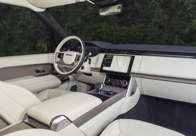 실내 대시보드 중앙에는 역대 랜드로버 모델 중 가장 큰 13.1인치 커브드 플로팅 터치스크린을 넣어 미니멀한 프레임 디자인으로 인테리어의 조형적 가벼움을 구현했다. 스티어링 휠에는 강한 수평 디자인을 적용해 안정감을 준다. 센터 콘솔의 결이 살아있는 고급스러운 우드 피니셔에는 메탈 소재를 아주 얇게 상감한 마이크로 메탈 인레이를 최초로 도입했다.