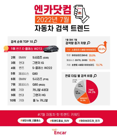 올 초 1월에 비해 7월 검색량이 상승하는 경향을 보인 차종은 SUV가 주를 이뤘다. 올해 1월 대비 7월 검색량 추이를 분석한 결과, 기아 스포티지 5세대 하이브리드는 33.50%, 투싼 하이브리드(NX4)는 21.01%, 기아 쏘렌토 4세대 하이브리드는 13.71% 상승했다. 이 외에도 제네시스의 SUV 모델 GV70과 GV80의 검색량도 19% 증가했으며, 기아 순수 전기차 EV6도 22.05% 올랐다.