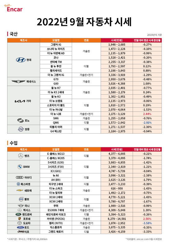 엔카닷컴이 2022년 9월 중고차 시세를 2일 공개했다. 이번에 공개된 중고차 시세는 엔카닷컴 빅데이터를 토대로 현대차, 기아, 르노코리아차, 쌍용차 등 국내 완성차 브랜드와 벤츠, BMW, 아우디 등 수입차 브랜드의 2019년식 인기 차종 중고차 시세를 분석한 결과다. 주행거리 기준은 60,000km이며 무사고 차량을 대상으로 분석했다.