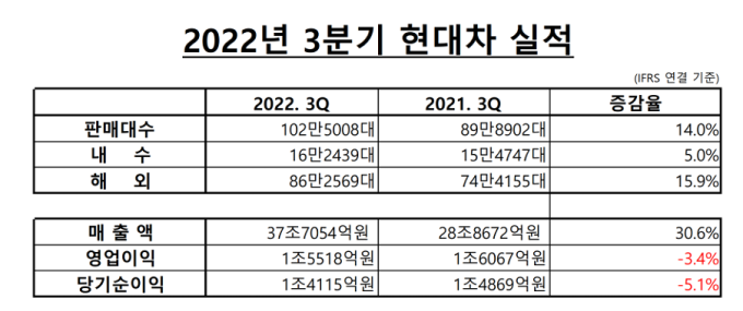 현대차 측은 "여러 경영 불확실성이 지속되고 있으나 차량용 반도체 공급 상황이 점차 개선세를 보이면서 4분기 판매는 3분기 대비 증가할 것으로 전망한다"라며 "3분기 품질비용 반영에도 불구하고 사상 최대 연간 매출액 및 영업이익 달성을 예상한다"라고 밝혔다.