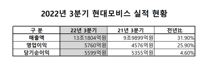 현대모비스는 2022년도 3분기 경영실적을 28일 공시했다. 올 3분기 매출액은 13조1804억원으로, 전년대비 31.9%나 급증했다. 영업이익도 작년 3분기보다 25.9% 오른 5760억원을 달성했다.