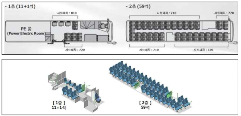 2층 전기버스는 1층에는 운전석을 포함해 12개의 좌석이 있고 2층에는 59개의 좌석으로 이뤄졌다. 1층 후면에는 전기차의 배터리와 관련한 부품들이 들어갔다.