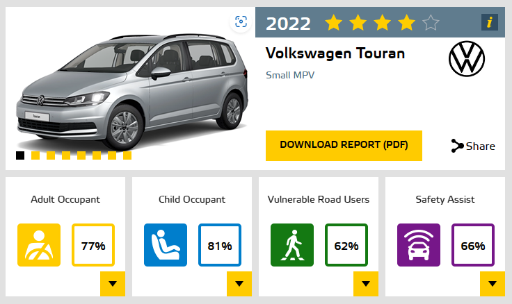 폭스바겐 투란은 어린이 탑승자 보호에서는 81%로 가장 높은 점수를 받았지만 보행자 보호 부문에서 가장 낮은 62%를 받았다. 유로 NCAP은 "투란은 모든 테스트 위치에서 보행자의 다리는 잘 보호했지만 골반 보호는 매우 열악했다"고 밝혔다.