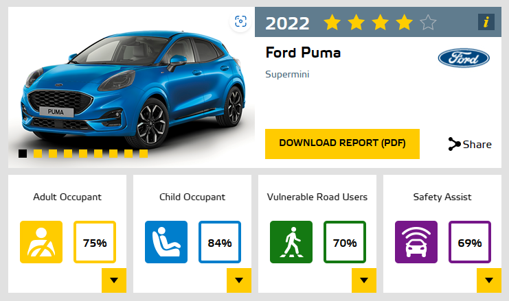 포드 푸마 역시 어린이 탑승자 보호에서 84점으로 가장 높은 점수를 획득했다. 그러나 안전 보조 시스템에서는 69%에 그쳤다. 유로 NCAP에 따르면 푸마의 자율비상제동시스템(AEB)는 다른 차량에 대한 반응 테스트에서 우수한 성능을 보였지만, 앞좌석과 헤드레스트의 성능이 미미해 저속 AEB 성능에 대한 점수는 받지 못한 것으로 나타났다.