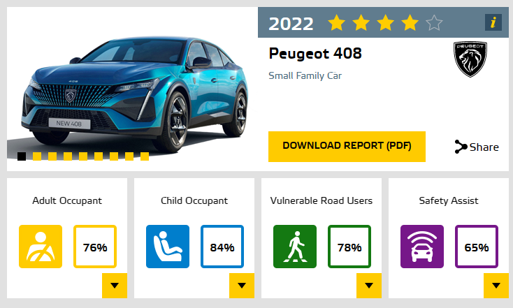 푸조 408 역시 안전 보조 시스템 부문에서 65%로 가장 낮은 점수를 기록했다. 이번 결과는 2022년 초 테스트를 거친 푸조 308과 관련도가 높으며, 일부 테스트가 추가 수행됐지만 등급은 푸조 308의 결과에 기반해 공개됐다.