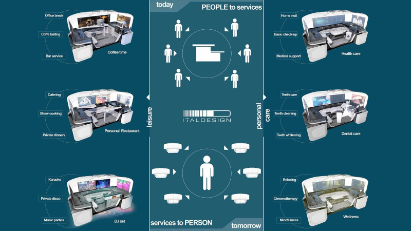 캐빈에 승객이 탑승하지 않으면, 영화관이나 카페, 소회의실 등 공간으로도 활용할 수 있다. 또한, 앱을 통해 기본 의료 지원 서비스와 치과 치료, 마사지 등 서비스도 제공된다.