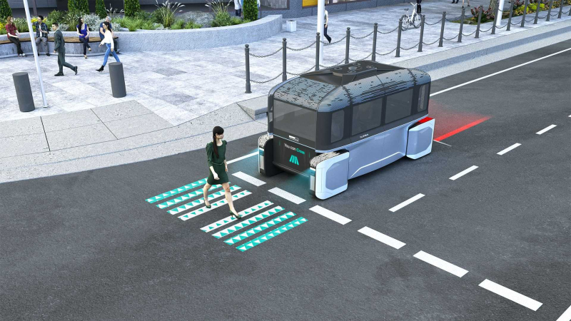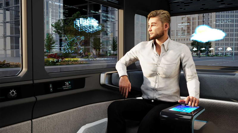 탑승 후 건물 밖으로 나오면, 전기 공유 플랫폼과 결합된다. 이 플랫폼은 완전 자율주행 기능뿐 아니라 조명을 통해 차량 진행이나 의도를 표시한다.