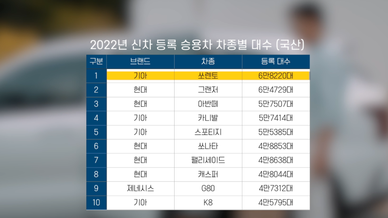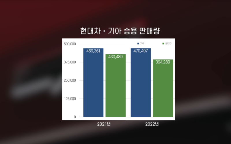 예년과 달라진 점은 현대차와 기아의 판매량입니다. 상용차를 뺀 승용차 부문에서 양사 판매 격차는 한층 더 벌어졌습니다. 기아가 지난해 내수 시장에서 47만497대를 판 반면, 현대차는 2021년 43만489대에서 2022년 39만4289대로 떨어졌습니다.