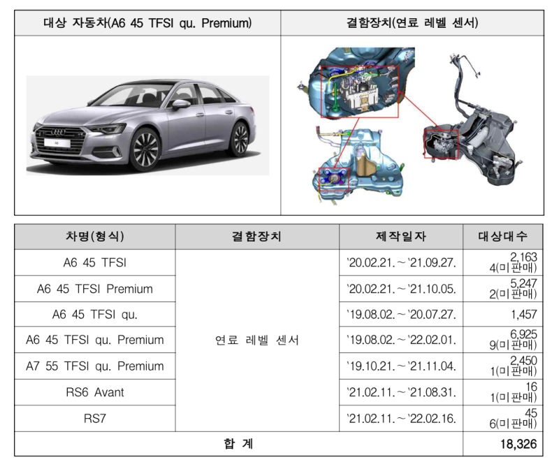 리콜 대상은 A6 45 TFSI, A7 55 TFSI, RS6 아반트, RS7 등 7개 차종 1만8326대(판매 이전 차량 포함)이다.