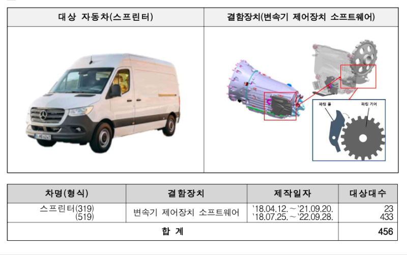 리콜 대상은 2018년부터 2022년까지 제작된 스프린터 456대이다.