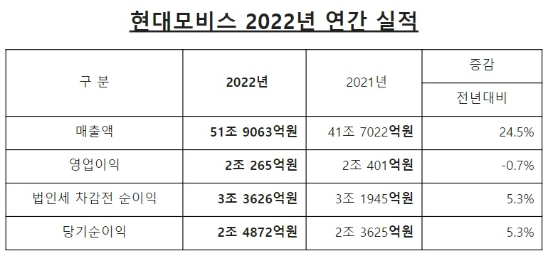 현대모비스는 27일 2022년도 연간 실적을 발표했다. 지난해 매출은 전년대비 24.5% 급증한 51조9063억원을 달성했다.