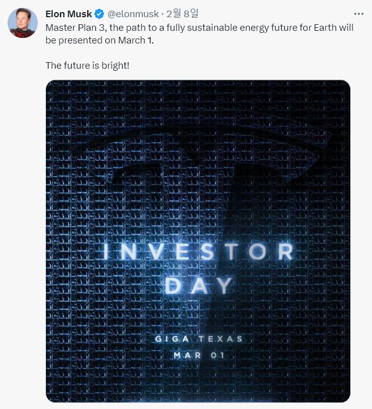 머스크는 최근 트위터를 통해 "마스터 플랜3, 지구를 위한 완전 지속 가능한 미래 에너지의 길이 3월 1일 제시될 것"이라고 전했다.