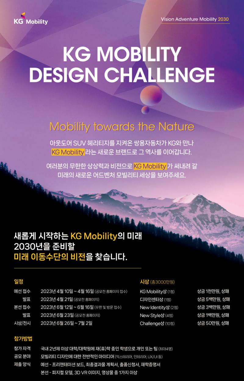 쌍용차 디자인센터장 이강 상무는 “이번 디자인 공모전을 통해 미래 모빌리티 산업을 이끌어갈 예비 디자이너들의 실력을 마음껏 발휘할 수 있는 장이 되었으면 한다”며 “우수 응모작 중 참신한 아이디어는 향후 KG 모빌리티의 미래 30년을 준비할 디자인 비전 정립 시 적극 반영하겠다”고 밝혔다.