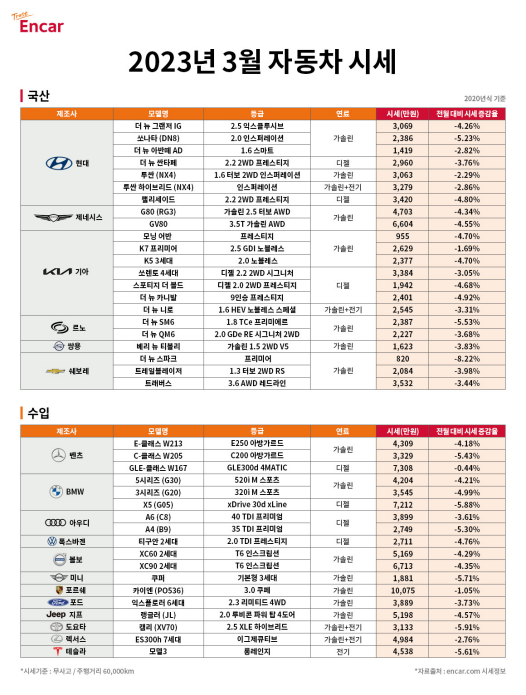 엔카닷컴이 2023년 3월 중고차 시세를 공개했다. 이번에 공개된 중고차 시세는 엔카닷컴 빅데이터를 토대로 현대차, 기아, 르노코리아차, 쌍용차 등 국내 완성차 브랜드와 벤츠, BMW, 아우디 등 수입차 브랜드의 2020년식 인기 차종 중고차 시세를 분석한 결과다. 주행거리 기준은 6만km이며 무사고 차량을 대상으로 분석했다.
