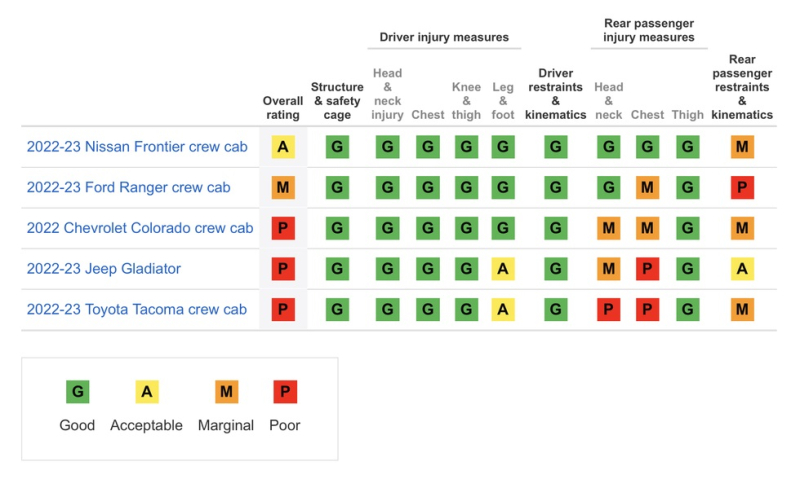 IIHS는 스몰오버랩 충돌 상황을 가정한 테스트에서 닛산 프론티어만이 양호하단 의미의 A(Acceptable) 등급을 받았으며, 포드 레인저는 미흡(Marginal), 쉐보레 콜로라도와 지프 글래디 에이터, 토요타 타코마는 모두 최하위 점수인 Poor를 기록했다.