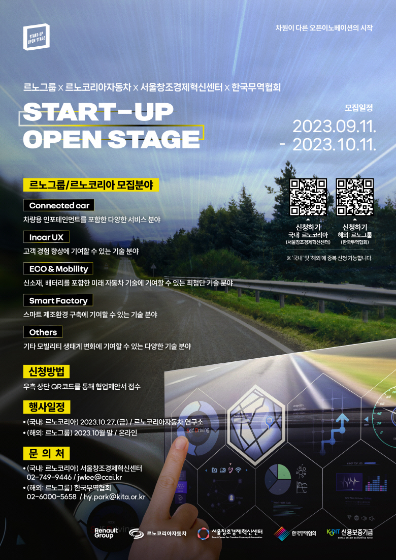 르노코리아가 11일부터 서울창조경제혁신센터, 한국무역협회와 함께 스타트업 오픈 스테이지를 개최한다.