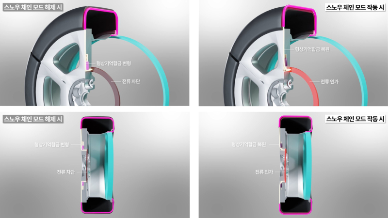 스노우 체인 일체형 타이어 기술은 휠과 타이어에 일정 간격으로 홈을 만들고 그 안에 형상기억합금으로 제작된 모듈을 하나씩 넣은 구조다. 모듈은 평상시에는 휠과 타이어 내부에 숨어있다가 전기적 신호를 받으면 타이어 바깥으로 돌출되며 스노우 체인의 역할을 한다.