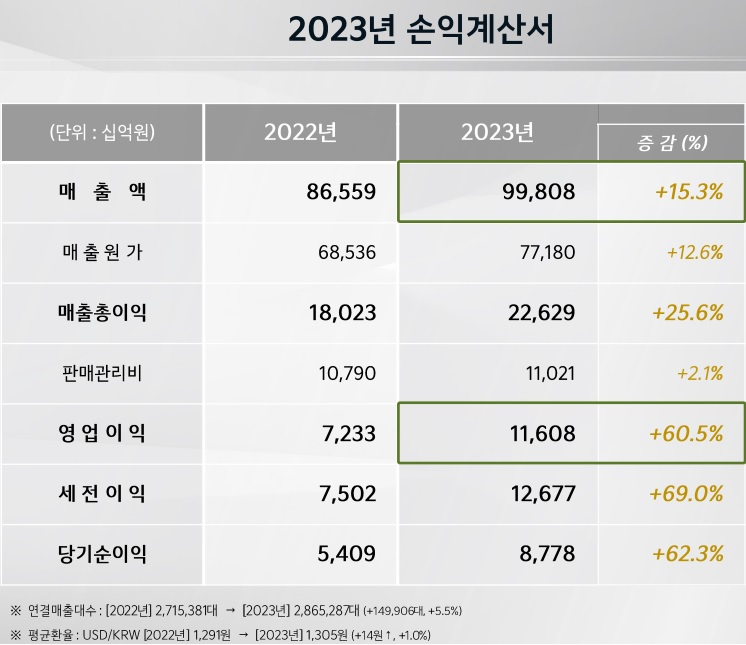 작년 한 해 신차 판매 대수는 전년대비 6.4% 늘어난 308만7384대이며, 매출액은 재작년보다 15.3% 증가한 99조8084억원을 기록했다. 이어 영업이익은 11조6079억원(전년비 +60.5%), 당기순이익은 8조7778억원(전년비 +62.3%)으로 역대 최대 실적을 달성했다.
