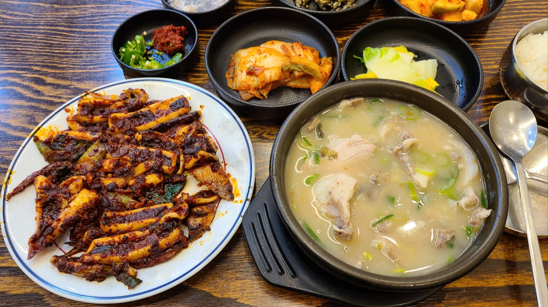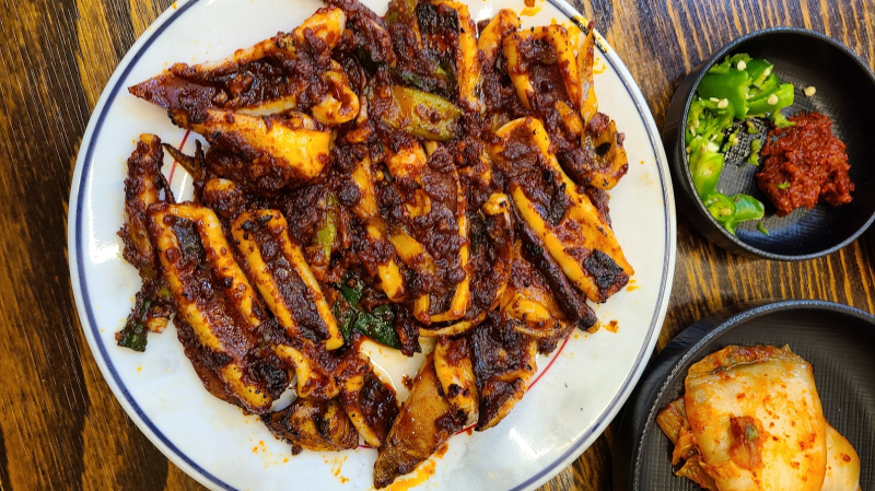 여기에 오징어불고기를 반찬처럼 곁들여 먹으면 두 맛의 조합이 왜 어울리지 하며 놀라게 된다. 오징어불고기는 경북 지방에서 생선을 숯불에 구워 먹던 전통이 이어진 것이다. 양미리, 간고등어와 같이 시간이 지나도 상하지 않는 음식을 경상도 북부지방 사람들은 소죽을 끓인 등걸불에 불 맛을 입혀 구워 먹는다. 단골식당의 오징어불고기도 사실은 오징어 석쇠구이 같은 방식이다. 잡자 마자 배 안에서 얼린 오징어에 양념을 발라 구운 오징어불고기는 사실 불 맛 보다 양념에 숨은 비결이 있어 보인다. 첫 주인이 하던 방식을 고수하고 있다는 자손 주인들의 노력이 고맙다.