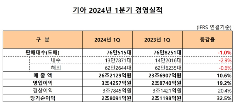 기아 측은 "전기차의 성장률 둔화 등 글로벌 산업 수요가 제한적인 회복세를 보인 가운데, 전기차 판매 약화, 내연기관 및 하이브리드 차종의 일시적 공급 부족으로 전년대비 소폭 감소했다"라며 "판매가 소폭 감소했음에도 고수익 차량 중심 판매로 인한 가격 상승과 믹스 개선, 원자재 가격 하락에 따른 재료비 감소, 원화 약세에 따른 긍정적인 환율 효과 등으로 수익성이 확대됐다"라고 전했다.