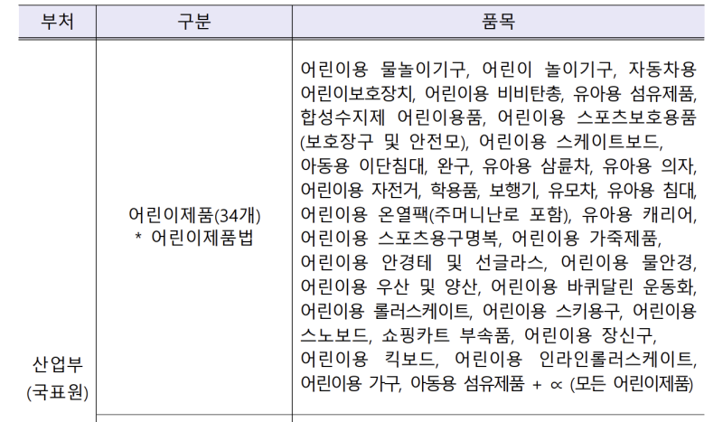 정부는 13살 이하 어린이가 사용하는 유모차, 장난감 등 34개 품목을 KC 인증이 없는 경우 직구를 금지하기로 했다. 여기에는 어린이용 장난감 외에도 자동차용 어린이 보호장치 등이 포함되며 마지막 단서로는 ‘모든 어린이제품)이란 조항까지 붙여 직구 차단의 한도를 무한으로 설정했다. 이외에도 전기 생활용품 34개와 생활 화학제품 12개가 직구 금지 품목에 포함됐다.