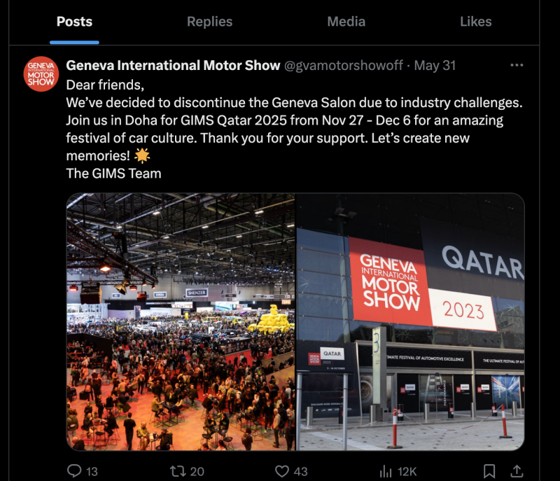 지난 달 31일 제네바모터쇼 공식 트위터 계정에는 “산업 변화로 제네바 모터쇼의 중단을 결정했다”라는 말을 시작으로 모터쇼의 영구 폐막을 알리는 글이 게시됐다.