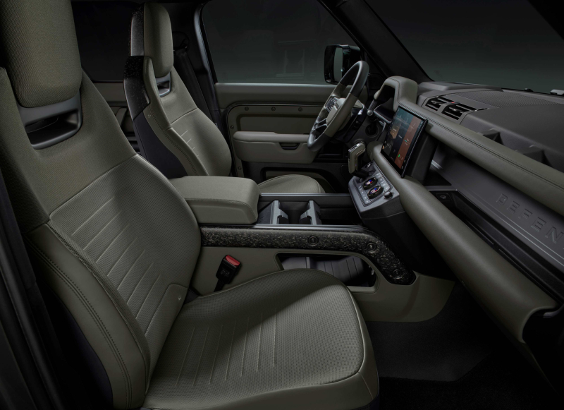 시트에는 가죽보다 30% 가볍고 내구성도 뛰어난 두 가지 울트라패브릭스 PU 옵션이 제공된다. 이 시트 마감은 3D 니트 텍스타일과 간결하고 매끄러운 마감의 카키 및 에보니 투톤으로 올 뉴 디펜더 OCTA 에디션 원에 기본 제공된다. 올 뉴 디펜더 OCTA의 기본 인테리어는 새로운 번트 시에나(Burnt Sienna) 세미 애닐린 가죽과 에보니 색상의 크바드라트(Kvadrat™) 텍스타일 트림이다.