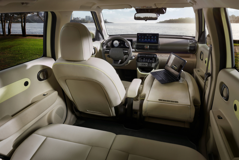 실내에는 10.25인치 컬러 LCD 클러스터와 내비게이션, 인터랙티브 픽셀 라이트가 탑재된 스티어링 휠, 앰비언트 무드램프 등을 적용했다. 또한 스티어링 칼럼 탑재 전자식 변속 칼럼을 적용해 센터페시아 하단부를 슬림화하고, 벤치 타입 시트 형상으로 1열간 편안한 이동이 가능하다.