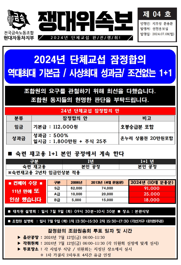 주요 내용은 ▲기본급 인상 4.65%(11만2000원 호봉승급분 포함), ▲2023년 경영성과금 400%+1000만원, ▲2년 연속 최대 경영실적 달성 기념 별도 격려금 100%+280만원, ▲재래시장상품권 20만원, ▲임금교섭 타결 관련 별도 합의 주식 5주 등이다. 여기에 '글로벌 누적판매 1억대 달성'이 예상되는 9월경 품질 향상 격려금 500만원+주식 20주 지급을 특별 합의했다.