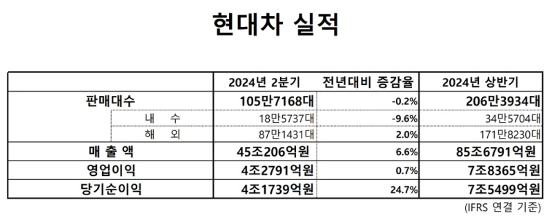 2분기 글로벌 신차 판매대수는 105만7168대이며, 경영실적(IFRS 연결 기준)은 매출 45조206억원, 영업이익 4조2791억원, 당기순이익 4조1739억원(비지배지분 포함) 등을 각각 기록했다.