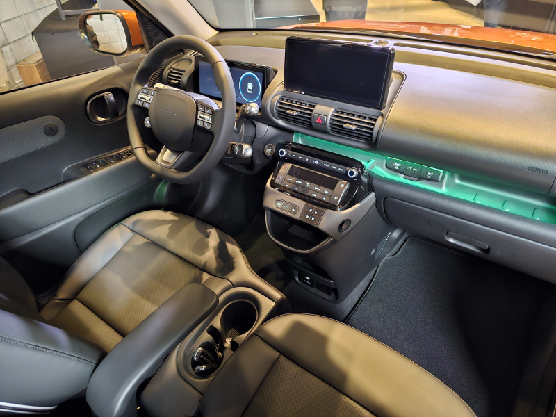 앞좌석은 기계식 자동 변속 레버 대신 컬럼식 변속 레버(SBW)를 적용하고, 스마트폰 무선 충전기와 V2L을 탑재해 공간과 사용 편의성을 동시에 강화했다. 센터페시아의 돌출된 부분을 45mm 줄여 공간을 확보함과 동시에 컵홀더 사이즈를 키우고 위치를 앞쪽으로 당겨 사용 편의성도 높였다.