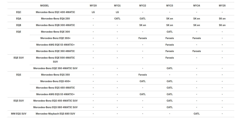 아울러 EQE 300과 EQS SUV, EQS 일부 모델은 중국 1위 배터리 회사인 CATL의 배터리 셀을 넣었다. EQA의 경우 22년 모델까지 CATL 배터리 셀을 탑재했으나, 23년 모델부터 SK on 배터리 셀을 적용한 것으로 알려졌다. 이 외에도 EQC에는 LG 배터리 셀을 넣는 등 다양한 제조사로부터 배터리 셀을 공급받고 있다.