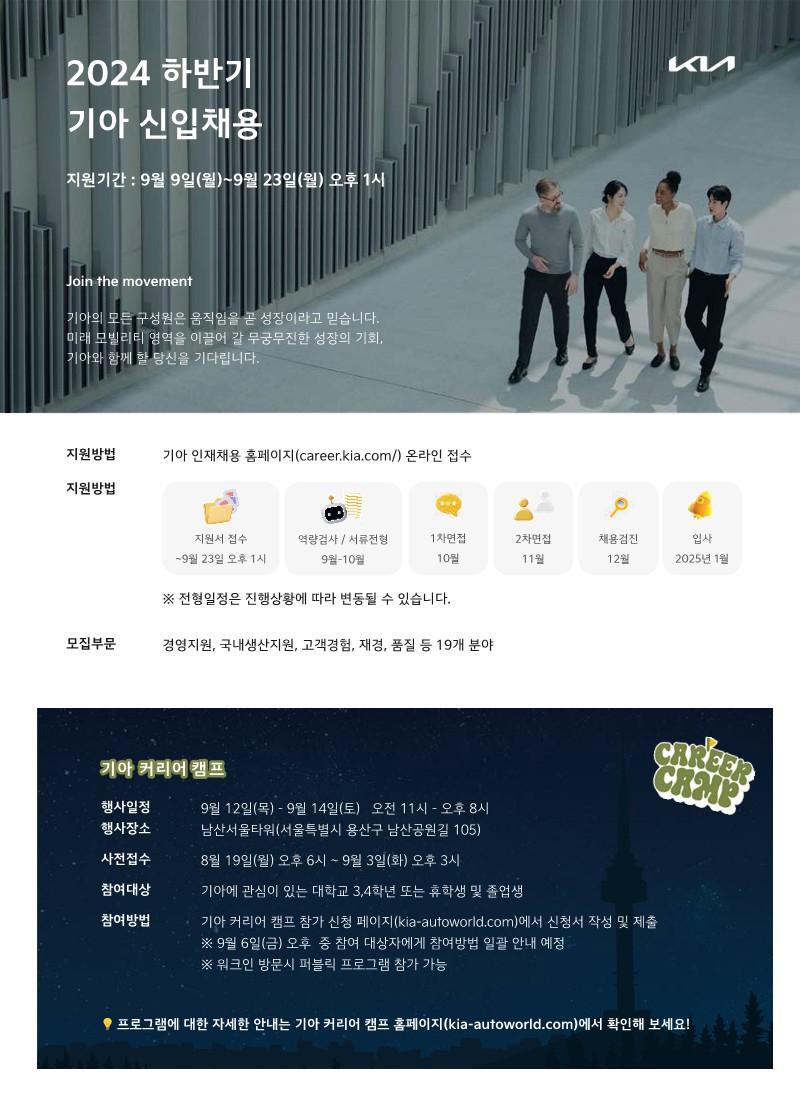 기아 관계자는 "다양한 인재를 채용해 보다 창의적인 조직 경쟁력으로 미래 모빌리티 산업을 주도할 계획"이라며 "도전적이고 역량 있는 인재들의 많은 관심과 지원을 바란다"고 말했다.
