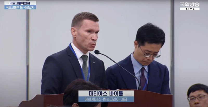 메르세데스-벤츠코리아 마티아스 바이틀 대표가 7일 국회 국토교통위원회 국정감사에서 인천 청라 화재 사건의 증인으로 출석했다.
