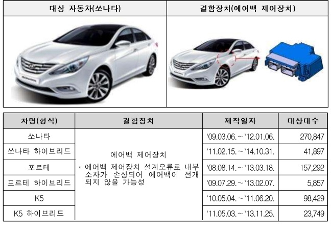 리콜 대상은 쏘나타 27만847대, 쏘나타 하이브리드 4만1897대, 포르테 15만7292대, 포르테 하이브리드 5857대, K5 9만8429대, K5 하이브리드 2만3749대 등 총 59만8071대이다.