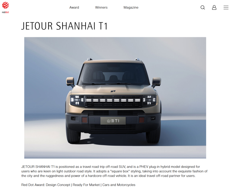 중국 체리자동차의 자회사 제투어(Jetour)가 '샨하이 T1(Shanhai T1)'으로 '2024 레드 닷 어워드: 디자인 콘셉트(Red Dot Award: Design Concept 2024)'를 수상했다.