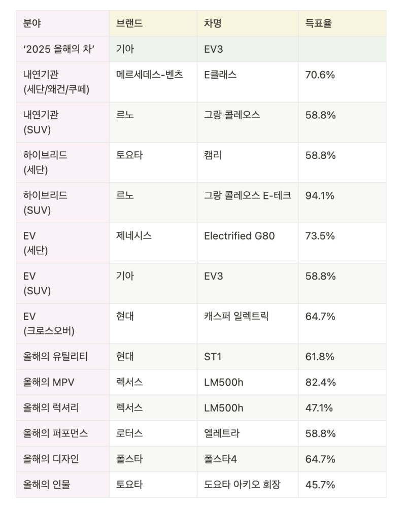 ** '2025 올해의 차' 선정 목록 **
